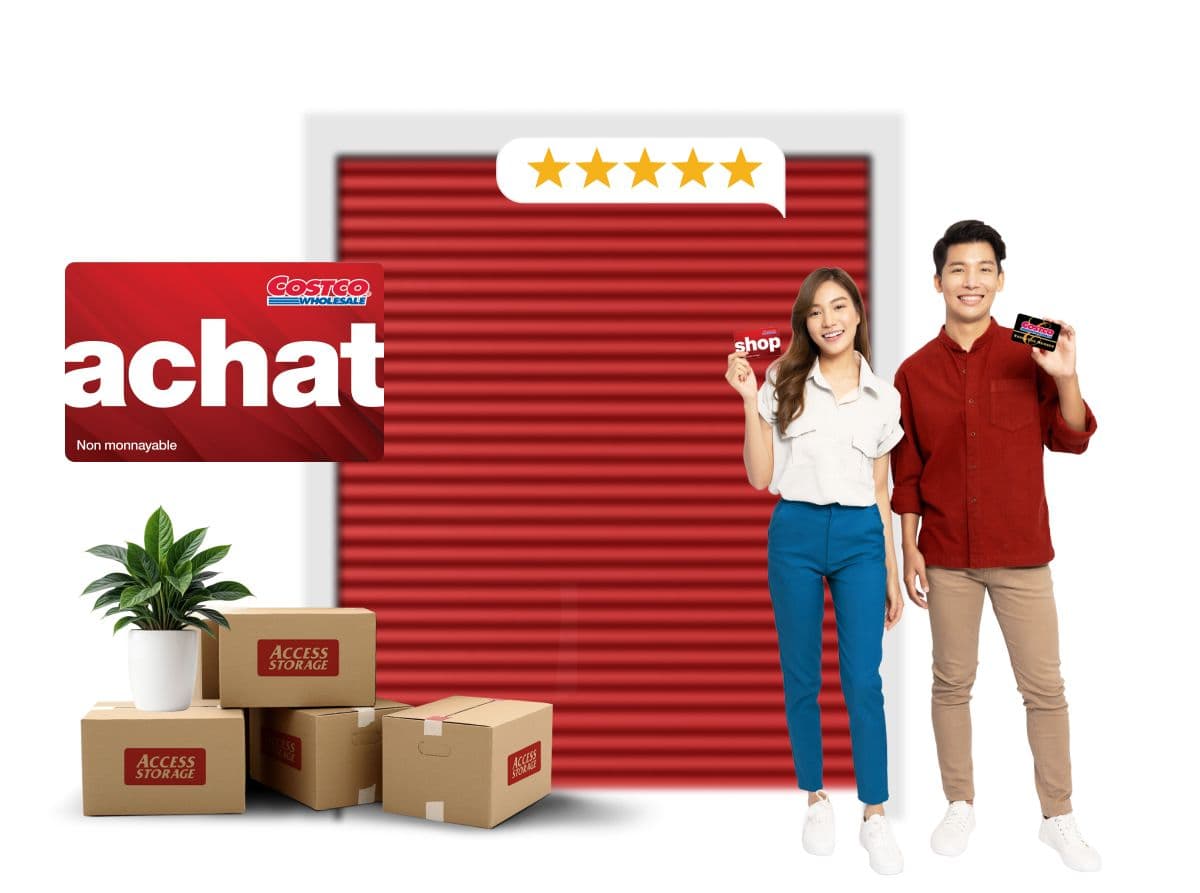 *Grâce à ce programme exclusif, en plus des offres en cours pour les emménagements, les membres de Costco recevront des cartes Achat numériques de Costco, dont la valeur est établie en fonction de la taille de l’unité d’entreposage et la durée de la location.